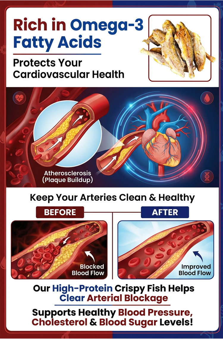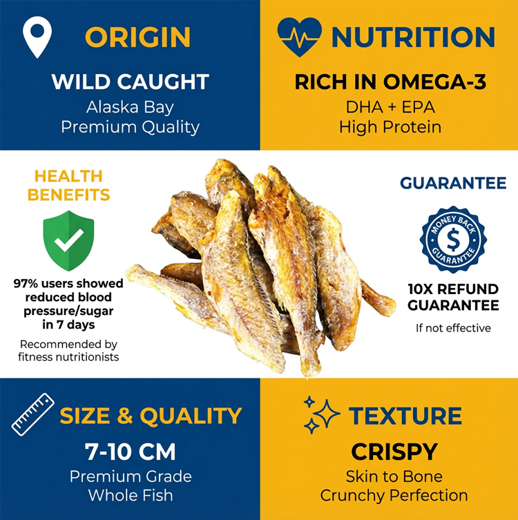💪 Fitness nutritionists recommend! Wild-caught from Alaska Bay—100% natural, no preservatives. Crispy from skin to bone, 7-10cm one-bite size, high protein & rich in Omega-3 (DHA+EPA) to support heart health. 97% users saw lower blood pressure/sugar in 7 days, 10x refund if not effective! 50% OFF: 1 for $42 (30-40 fish), 4 for $58 (120-180 fish)—only $0.32/fish! 🚚 Free shipping + ships in 1-2 days + 7-day free returns. Perfect for post-workout snacks, office breaks, or guilt-free munching!